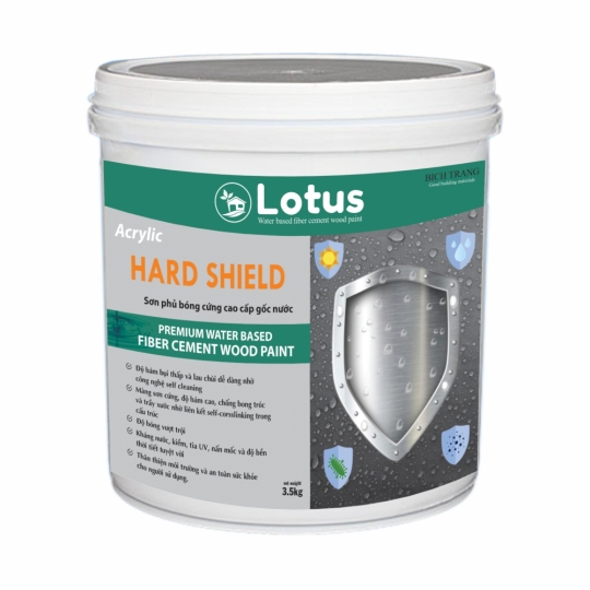 Sơn phủ bóng cứng Lotus Hard Shield là sơn phủ bóng trong suốt ngoại thất cao cấp gốc nước, có độ cứng và độ bám cao, được sử dụng để phủ bóng, kháng trầy xước, chống thấm và bảo vệ các bề mặt gỗ, bê tông, đá trang trí, xi măng, các vật liệu giả gỗ làm sàn, ngói
